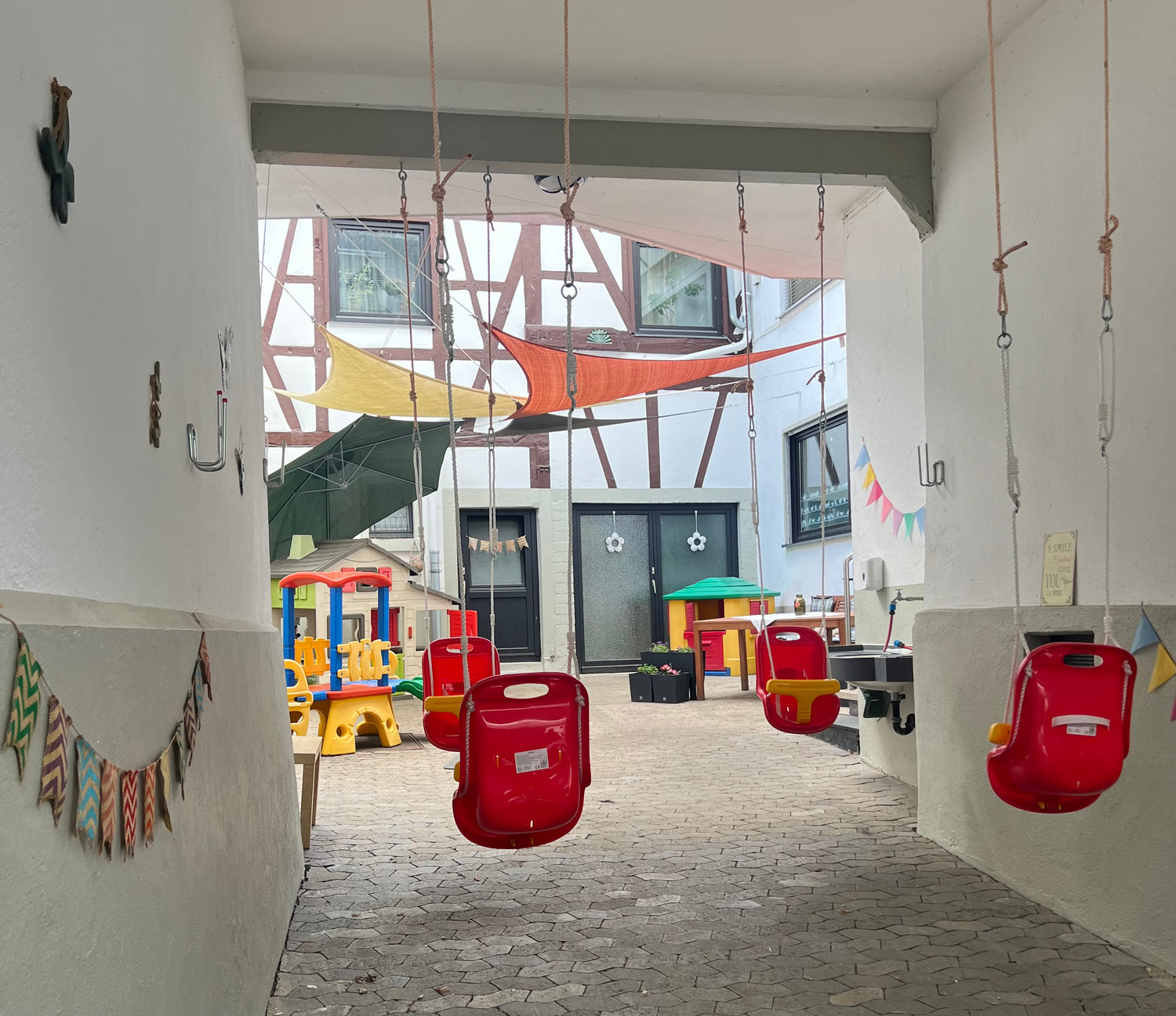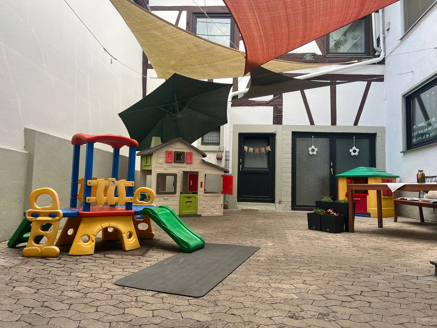 Unser schöner, teils überdachter Innenhof, lädt an heißen und regnerischen Tagen zum Schaukeln, Rutschen, Toben und Spielen im Spielhaus, mit den kleinen Freunden ein.